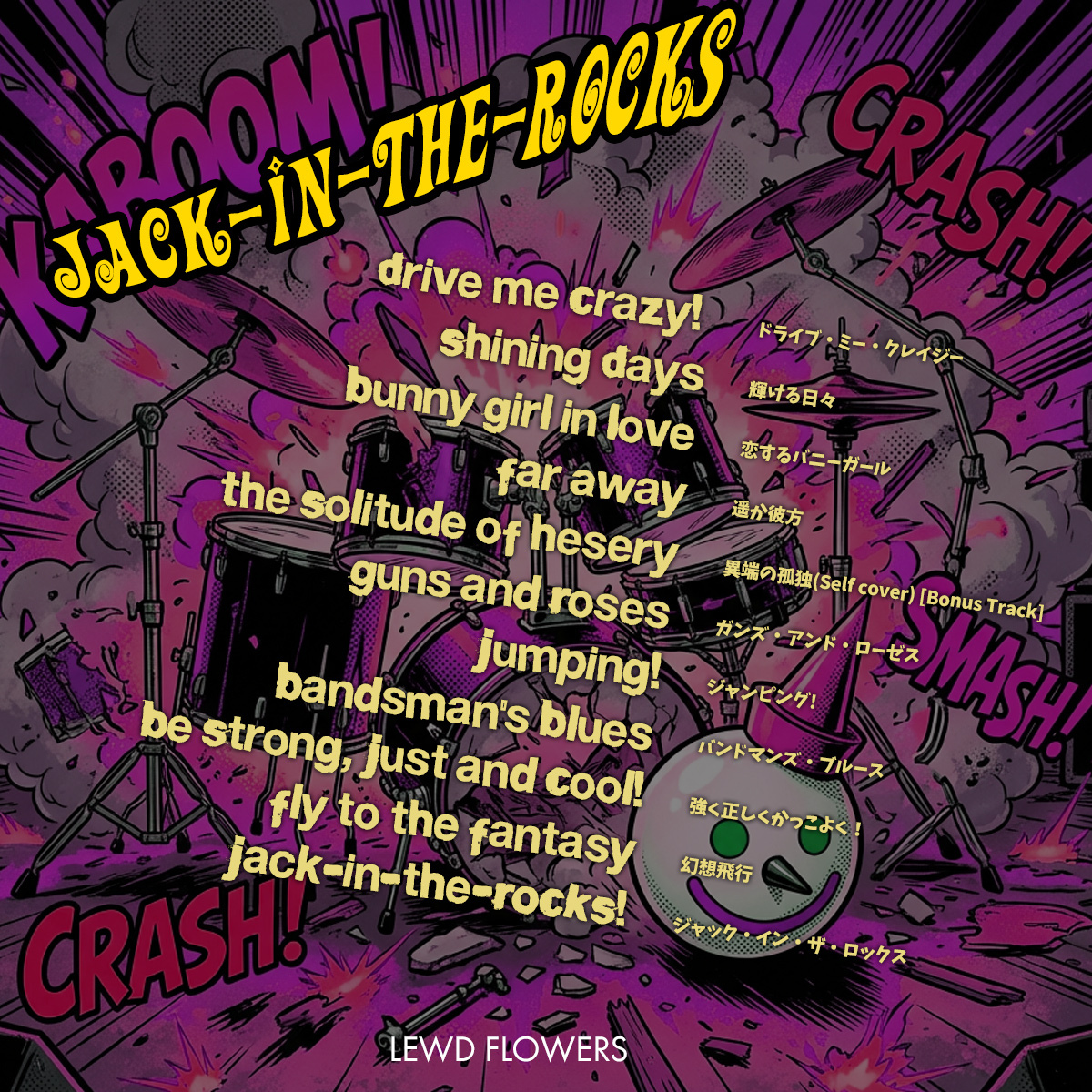 「びっくり箱=英語だとJack-in-the-Box」をもじったタイトルの、何が飛び出すかわからないLEWD FLOWERSならではの多彩な楽曲が詰まったROCKびっくり箱。
