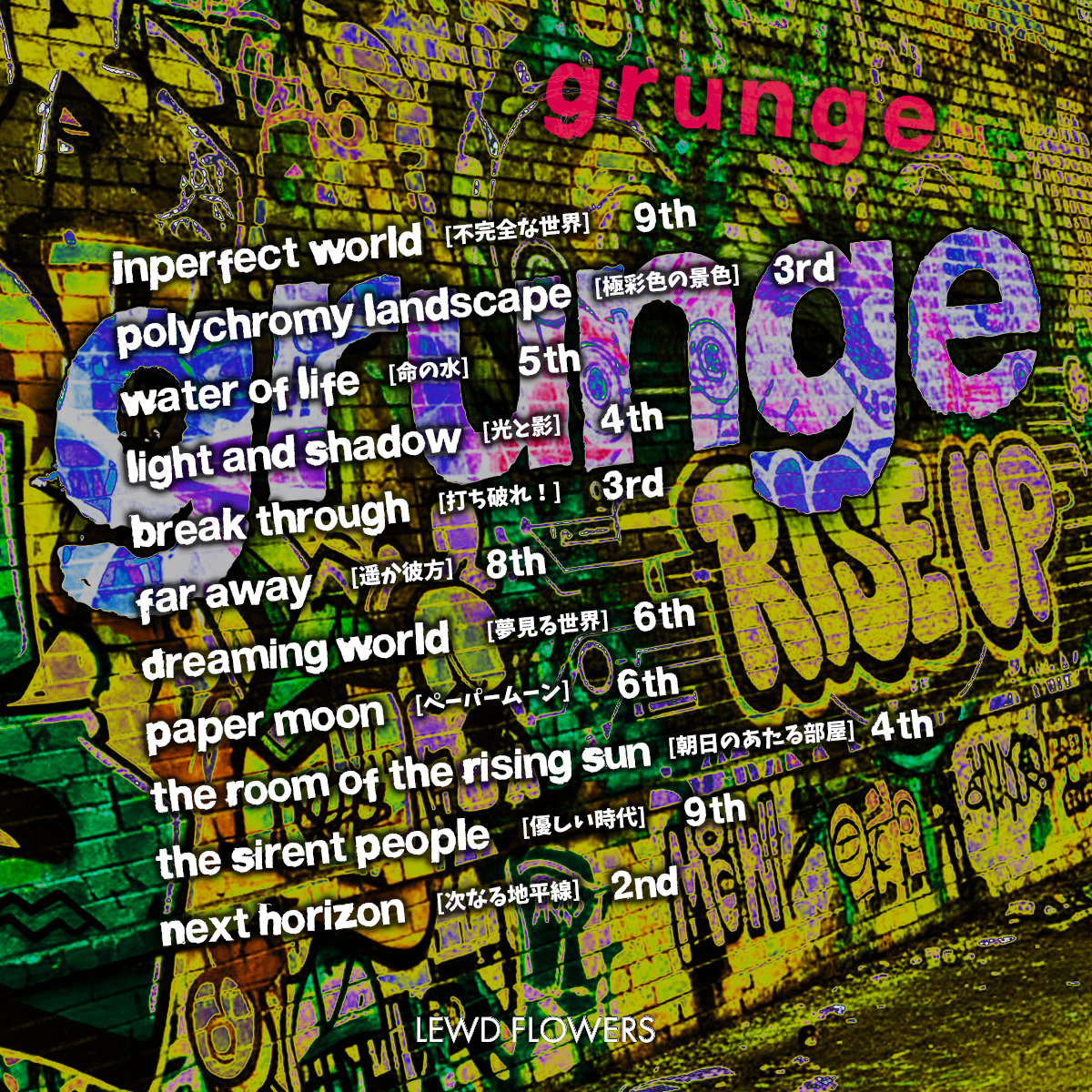 9th アルバムまでからGrunge Rockナンバーをピックアップしたセレクションアルバムをリリースしました。タイトルはズバリ「Grunge」。LEWD FLOWERSならではの名曲揃いのグランジロックの世界を味わってください